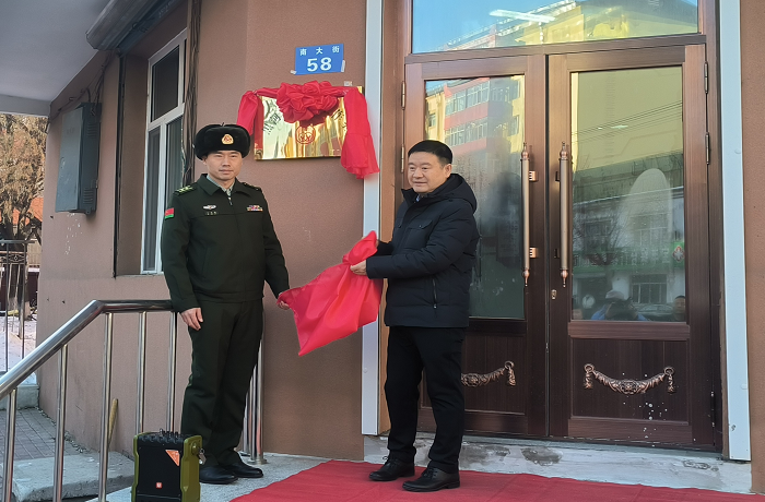 图一:黑河市退役军人事务局局长肖玉柱和黑河军分区政治工作部副主任卜文豹为黑河市双拥工作室揭牌